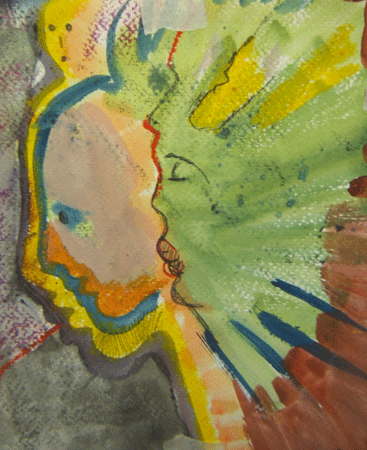 Pastel gras et secs, gouache, aquarelles et crayons divers sur papier aquarelle. Détail d'un dessin plus grand.